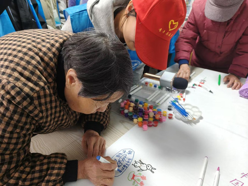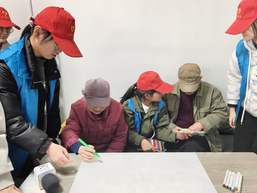 活动在“老时光盲盒”的温情分享中拉开序幕。老人们围坐一圈,从志愿者手中抽取写有不同年代的卡片,纷纷打开话匣子,讲述起年轻时的难忘故事;随后,“怀旧趣味园”里传来阵阵笑语,软沙包轻轻传递,彩色套圈缓缓落下,猜灯谜环节更是唤起大家对往昔民俗的亲切回忆;在“时光寄语墙”环节,老人们用彩色便签写下对过去的怀念、对当下的珍惜,或是一句对未来的悄悄期盼。笔迹或许颤抖,心意却真挚如初;最温馨的环节莫过于“同心绘祝福”,老人们与志愿者共同用手印、简笔画装点大幅画布,勾勒出“岁月静好,福寿绵长”的生动图景。活动尾声,志愿者为每位老人送上承载祝福的小礼品,并与大家合影留念,约定下次再见,在悠扬的老歌轻唱中,温暖在彼此心间久久流淌。