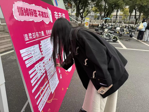本次活动最具亮点的是“撕掉标签”寄语墙。展板上张贴着“你就该温柔”“不必太要强”等刻板印象标签,同学们纷纷上前撕下标签、打破束缚,并写下专属自我宣言与暖心寄语。一张张便签凝聚着自信与勇气,一句句话语彰显着独立与态度,寄语墙逐渐被真挚文字填满,成为春日校园里一道直击心灵、充满力量的独特风景。