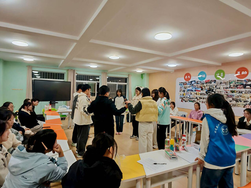 琤然一叶,秋色渐浓。转眼十月已至,湖师大已迎来了一群带着朝气的新面孔,徐徐展开与我们的新故事。为促进新生人际交往,增强班级凝聚力,在团体中实现自我成长。从10月20日起,湖北师范大学心理健康教育与咨询中心(以下简称“心理中心”)开展了以“与你同行,暖心护航”为主题的朋辈辅导活动。目前活动正在“一站式”学生社区总站心理中心有序进行中,此处无关刻意的社交技巧,只有一间藏着“成长拼图”的互动空间,每一场游戏、每一次分享,都是拼起“新朋友”“新集体”“新自己”的小碎片。帮你在笑声里拉近距离,在协作中找到归属感。