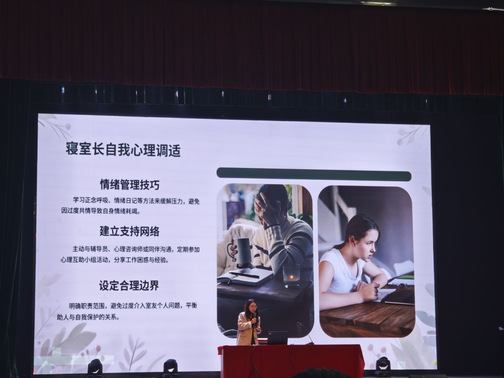 心理健康专职教师李小倩及夏婷婷老师聚焦“心理危机早期识别与上报流程”,拆解了“情绪突变”“行为异常”“言语消极”等典型信号,让宿舍长们既懂“识别”也懂“转介”。明确“看变化幅度”的判断标准,同时梳理“沟通-联系心理委员/辅导员-协助预约求助”的上报转介流程。有效推动了“校寝工作衔接”的有序开展,确保了危机高效转介,进一步筑牢寝室心理安全防线。